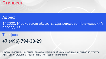 Стинвест по адресу 142000, Московская область, Домодедово, Племхозский проезд, 1а в дальнейшем Организация, размещена в следующих категориях: