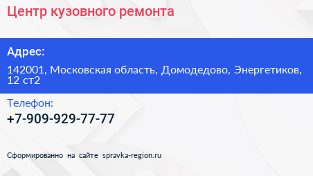 Центр кузовного ремонта по адресу 142001, Московская область, Домодедово, Энергетиков, 12 ст2 в дальнейшем Организация, размещена в следующих категориях: