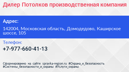 Дилер Потолков, производственная компания по адресу 142004, Московская область, Домодедово, Каширское шоссе, 105 в дальнейшем Организация, размещена в следующих категориях: