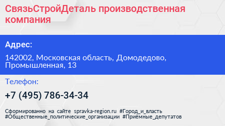 СвязьСтройДеталь, производственная компания по адресу 142002, Московская область, Домодедово, Промышленная, 13 в дальнейшем Организация, размещена в следующих категориях: