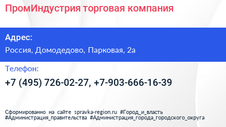 ПромИндустрия, торговая компания по адресу 2, Парковая улица, посёлок Государственного Племенного Завода "Константиново", городской округ Домодедово, Московская область, Центральный федеральный округ, 142001, Россия в дальнейшем Организация, размещена в следующих категориях: