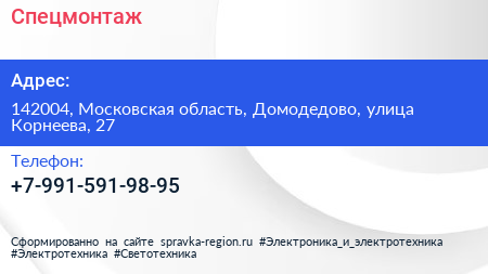 Спецмонтаж по адресу 142004, Московская область, Домодедово, улица Корнеева, 27 в дальнейшем Организация, размещена в следующих категориях: