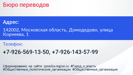 Бюро переводов по адресу 142002, Московская область, Домодедово, улица Корнеева, 1 в дальнейшем Организация, размещена в следующих категориях: