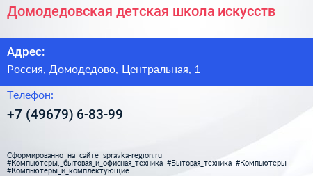 Домодедовская детская школа искусств по адресу Парковая улица, посёлок Государственного Племенного Завода "Константиново", городской округ Домодедово, Московская область, Центральный федеральный округ, 142001, Россия в дальнейшем Организация, размещена в следующих категориях: