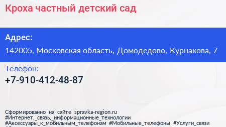 Кроха, частный детский сад по адресу 142005, Московская область, Домодедово, Курнакова, 7 в дальнейшем Организация, размещена в следующих категориях: