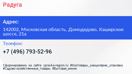 Радуга по адресу 142002, Московская область, Домодедово, Каширское шоссе, 21а в дальнейшем Организация, размещена в следующих категориях: