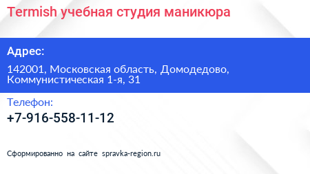 Termish, учебная студия маникюра по адресу 142001, Московская область, Домодедово, Коммунистическая 1-я, 31 в дальнейшем Организация, размещена в следующих категориях: