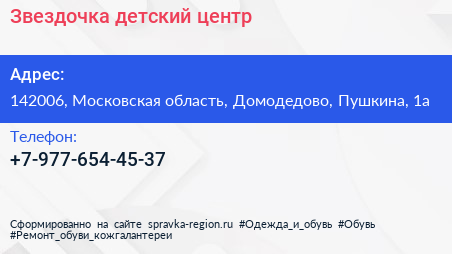 Звездочка, детский центр по адресу 142006, Московская область, Домодедово, Пушкина, 1а в дальнейшем Организация, размещена в следующих категориях: