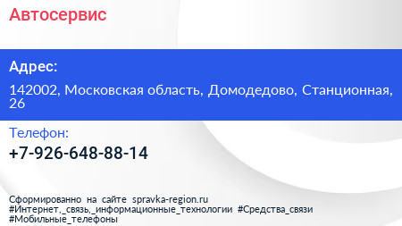 Автосервис по адресу 142002, Московская область, Домодедово, Станционная, 26 в дальнейшем Организация, размещена в следующих категориях: