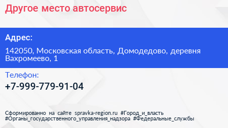 Другое место, автосервис по адресу 142050, Московская область, Домодедово, деревня Вахромеево, 1 в дальнейшем Организация, размещена в следующих категориях: