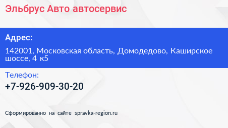 Эльбрус-Авто, автосервис по адресу 142001, Московская область, Домодедово, Каширское шоссе, 4 к5 в дальнейшем Организация, размещена в следующих категориях: