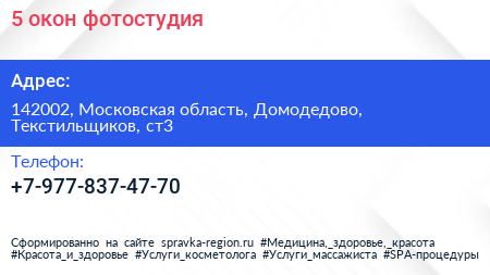 5 окон, фотостудия по адресу 142002, Московская область, Домодедово, Текстильщиков, ст3 в дальнейшем Организация, размещена в следующих категориях: