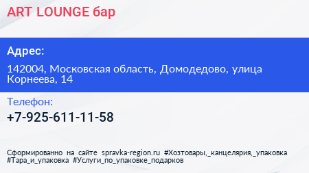 ART LOUNGE, бар по адресу 142004, Московская область, Домодедово, улица Корнеева, 14 в дальнейшем Организация, размещена в следующих категориях: