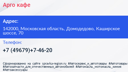 Арго, кафе по адресу 142000, Московская область, Домодедово, Каширское шоссе, 70 в дальнейшем Организация, размещена в следующих категориях: