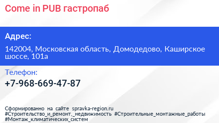 Come in PUB, гастропаб по адресу 142004, Московская область, Домодедово, Каширское шоссе, 101а в дальнейшем Организация, размещена в следующих категориях: