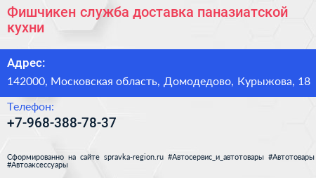 Фишчикен, служба доставка паназиатской кухни по адресу 142000, Московская область, Домодедово, Курыжова, 18 в дальнейшем Организация, размещена в следующих категориях: