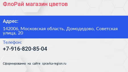 ФлоРай, магазин цветов по адресу 142006, Московская область, Домодедово, Советская улица, 20 в дальнейшем Организация, размещена в следующих категориях: