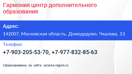 Гармония, центр дополнительного образования по адресу 142007, Московская область, Домодедово, Чкалова, 13 в дальнейшем Организация, размещена в следующих категориях: