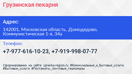 Грузинская пекарня по адресу 142001, Московская область, Домодедово, Коммунистическая 1-я, 34а в дальнейшем Организация, размещена в следующих категориях: