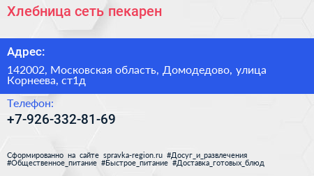 Хлебница, сеть пекарен по адресу 142002, Московская область, Домодедово, улица Корнеева, ст1д в дальнейшем Организация, размещена в следующих категориях: