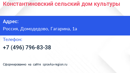 Константиновский, сельский дом культуры по адресу В. И. Ленину, Парковая улица, посёлок Государственного Племенного Завода "Константиново", городской округ Домодедово, Московская область, Центральный федеральный округ, 142001, Россия в дальнейшем Организация, размещена в следующих категориях: