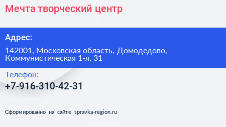 Мечта, творческий центр по адресу 142001, Московская область, Домодедово, Коммунистическая 1-я, 31 в дальнейшем Организация, размещена в следующих категориях: