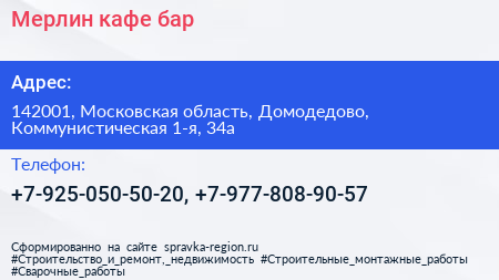 Мерлин, кафе-бар по адресу 142001, Московская область, Домодедово, Коммунистическая 1-я, 34а в дальнейшем Организация, размещена в следующих категориях: