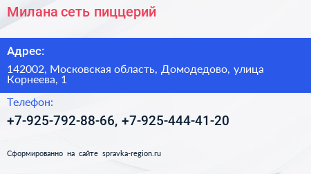 Милана, сеть пиццерий по адресу 142002, Московская область, Домодедово, улица Корнеева, 1 в дальнейшем Организация, размещена в следующих категориях: