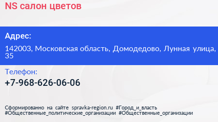 NS, салон цветов по адресу 142003, Московская область, Домодедово, Лунная улица, 35 в дальнейшем Организация, размещена в следующих категориях: