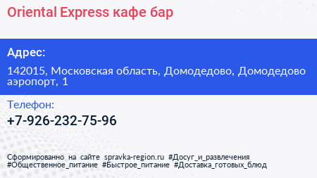 Oriental Express, кафе-бар по адресу 142015, Московская область, Домодедово, Домодедово аэропорт, 1 в дальнейшем Организация, размещена в следующих категориях: