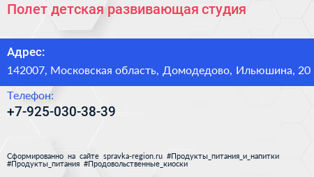 Полет, детская развивающая студия по адресу 142007, Московская область, Домодедово, Ильюшина, 20 в дальнейшем Организация, размещена в следующих категориях: