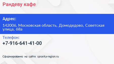 Рандеву, кафе по адресу 142006, Московская область, Домодедово, Советская улица, 68а в дальнейшем Организация, размещена в следующих категориях: