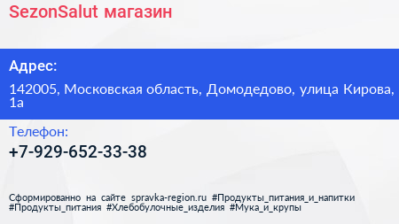 SezonSalut, магазин по адресу 142005, Московская область, Домодедово, улица Кирова, 1а в дальнейшем Организация, размещена в следующих категориях: