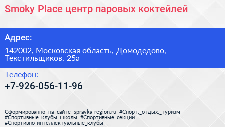 Smoky Place, центр паровых коктейлей по адресу 142002, Московская область, Домодедово, Текстильщиков, 25а в дальнейшем Организация, размещена в следующих категориях:
