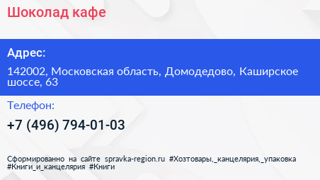 Шоколад, кафе по адресу 142002, Московская область, Домодедово, Каширское шоссе, 63 в дальнейшем Организация, размещена в следующих категориях: