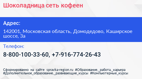 Шоколадница, сеть кофеен по адресу 142001, Московская область, Домодедово, Каширское шоссе, 3а в дальнейшем Организация, размещена в следующих категориях: