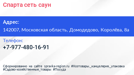 Спарта, сеть саун по адресу 142007, Московская область, Домодедово, Королёва, 8а в дальнейшем Организация, размещена в следующих категориях: