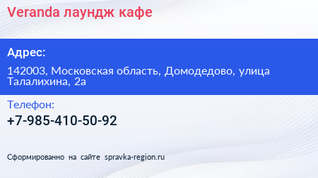 Veranda, лаундж-кафе по адресу 142003, Московская область, Домодедово, улица Талалихина, 2а в дальнейшем Организация, размещена в следующих категориях: