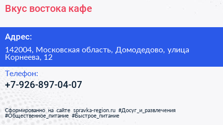 Вкус востока, кафе по адресу 142004, Московская область, Домодедово, улица Корнеева, 12 в дальнейшем Организация, размещена в следующих категориях: