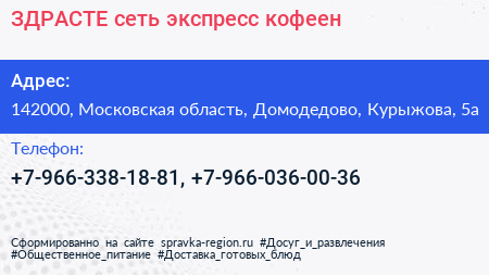 ЗДРАСТЕ, сеть экспресс-кофеен по адресу 142000, Московская область, Домодедово, Курыжова, 5а в дальнейшем Организация, размещена в следующих категориях: