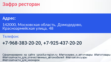 Зафрэ, ресторан по адресу 142000, Московская область, Домодедово, Красноармейская улица, 48 в дальнейшем Организация, размещена в следующих категориях: