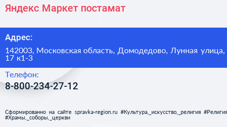 Яндекс.Маркет, постамат по адресу 142003, Московская область, Домодедово, Лунная улица, 17 к1-3 в дальнейшем Организация, размещена в следующих категориях: