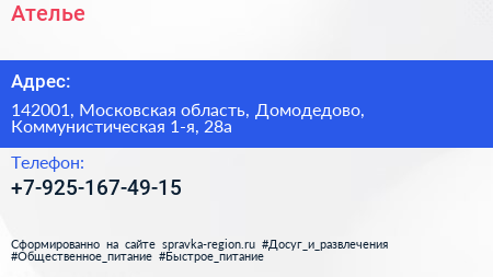 Ателье по адресу 142001, Московская область, Домодедово, Коммунистическая 1-я, 28а в дальнейшем Организация, размещена в следующих категориях: