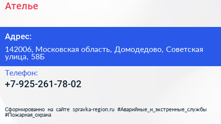 Ателье по адресу 142006, Московская область, Домодедово, Советская улица, 58Б в дальнейшем Организация, размещена в следующих категориях:
