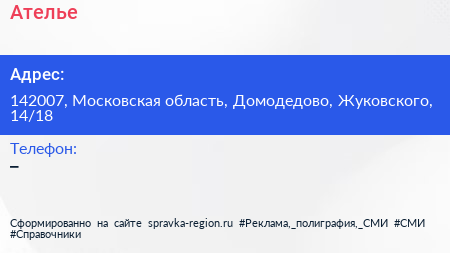 Ателье по адресу 142007, Московская область, Домодедово, Жуковского, 14/18 в дальнейшем Организация, размещена в следующих категориях:
