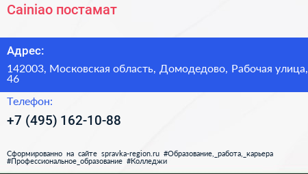 Cainiao, постамат по адресу 142003, Московская область, Домодедово, Рабочая улица, 46 в дальнейшем Организация, размещена в следующих категориях: