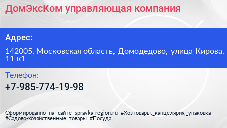 ДомЭксКом, управляющая компания по адресу 142005, Московская область, Домодедово, улица Кирова, 11 к1 в дальнейшем Организация, размещена в следующих категориях: