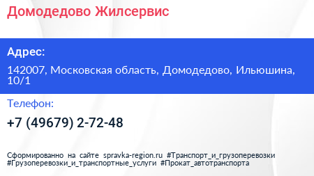 Домодедово-Жилсервис по адресу 142007, Московская область, Домодедово, Ильюшина, 10/1 в дальнейшем Организация, размещена в следующих категориях: