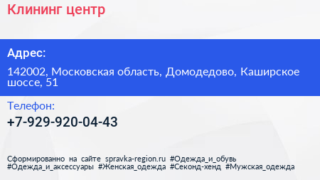Клининг-центр по адресу 142002, Московская область, Домодедово, Каширское шоссе, 51 в дальнейшем Организация, размещена в следующих категориях: