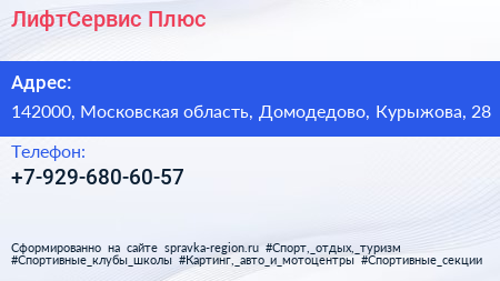 ЛифтСервис Плюс по адресу 142000, Московская область, Домодедово, Курыжова, 28 в дальнейшем Организация, размещена в следующих категориях: